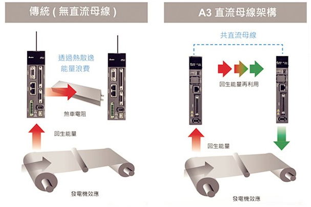 多軸共直流母線設(shè)計(jì),保持直流母線電壓穩(wěn)定,回生能量再利用,機(jī)械設(shè)備更節(jié)能